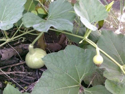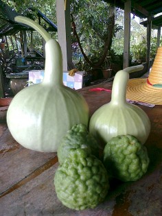 ผลผลิตของวันนี้ ลูกซ้ายคือน้ำเต้าลูกแรกของต้น ส่วนลูกขวาเกิดความผิดพลาดในการสื่อสารกับแม่ ก็หนูไม่รู้นี่นา...ตัดมาซะแว้ว