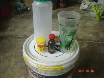 ขวดฝาเขียวใส่โซดาไฟ ฝาเหลือง วาสลิน ใช้ทาถาดทำพิม จุกแดง น้ำหอม แก้วกาแฟ ใช้ตวง