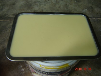 ตั้งไว้ในถาดนี้อีกวันหรือสองวัน จนก้อนแข็ง จึงค่อยเคาะออจากพิม แต่ถ้าขี้เกียจเคาะก็เอาไปแช่แข็งสักครึ่งวัน ก็จะเคาะออกได้ง่าย หลังจากนั้นก็เอามาตัดเป็นก้อนๆ ขนาดเหมาะมือ แล้วห่อด้วยกระดาษขาว กระดาษห่อไก่ปิ้ง ไก่ทอด ที่ซับน้ำมันได้ ทิ้งไว้อีก (ไม่ใช่ทิ้ง) ตั้งไว้อีก เดือนนึง แล้วค่อยเอามาใช้