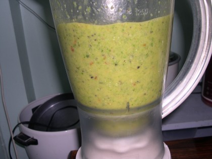หั่นทุกอย่างรวมกัน ใส่เครื่องปั่น ปั่นให้ละเอียด กรองเอาแต่น้ำใส่แก้ว