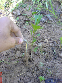 แล้วก็เอาเหล็กแทงรอบโคนกดเข้าหาต้นผักเหมียงเพื่อให้แน่น