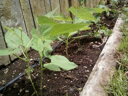 ถั่วแขกแบบต้นเตี้ย และมะเขือเทศปลูกเอาไว้ตามแนวรั้ว มะเขือเทศไกล้จะได้กินแล้ว พันธุ์นี้เป็นพันธุ์ลูกใหญ่พิเศษ จะคอยดูสิว่าจะใหญ่ขนาดใหน