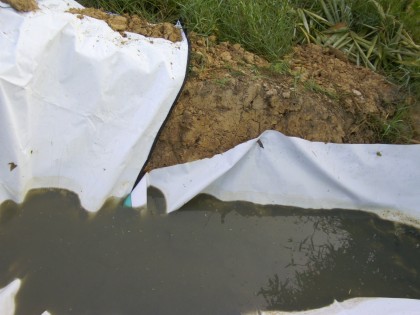 ใช้ผ้ายางปูรองก้นบ่อดินก่อน เพื่อกักเก็บน้ำทิ้งที่ปล่อยลงจากบ่อปลาดุก