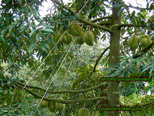 เขาเรียกโยงทุเรียนจ้า ลูกมันหนักแล้วกิ่งมันเล็ก ถ้าไม่โยงไว้ กิ่งอาจจะฉีกได้