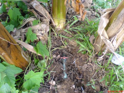 กลับมาถึงบ้านก็มีปัญหาให้กลุ้มใจครับระบบน้ำที่ผมทำไว้ในสวน พอสูบน้ำเต็มแทงค์ ไม่นานน้ำก็หายไปหมด ปัญหานี้มีมาก่อนผมเดินทางแล้ว แต่ช่วงนั้นฝนยังตกอยู่ก็เลยไม่จำเป็นต้องใช้น้ำมากนัก แต่ตอนนี้ซิครับเริ่มแล้งแล้ว ก็จำเป็นต้องสูบน้ำในสระขึ้นมาใช้ แต่ปัญหาน้ำหายไปนี่ซิ หาไม่เจอว่ามันหายไปไหน ถ้าท่อน้ำแตกก็คงมีน้ำซึมออกมา แต่นี่ก็ไม่มี วันนี้ยังไงก็ต้องหาให้เจอ เพราะต้องใช้น้ำ นึกเอะใจเลยไปขุดดูตรงต้นกล้วยที่ผมทำประตูน้ำเอาไว้ ตรงโคนต้นกล้วย ซึ่งตอนนี้ทั้งปลวกขึ้น ทั้งต้นกล้วยแตกหน่อขึ้นมา
